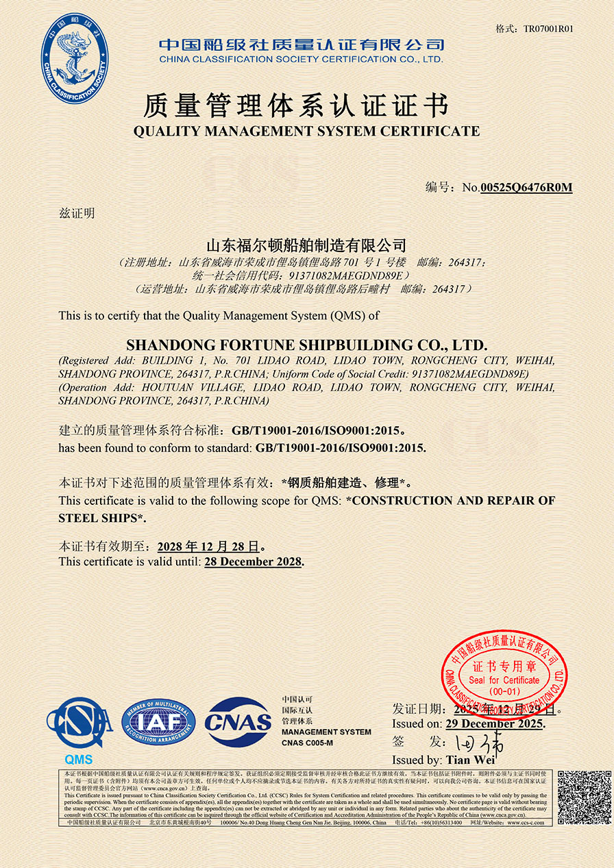 山东福尔顿船舶制造有限公司历史悠久,公司位于胶东半岛东端的威海荣成市俚岛镇,所在港区为天然避风深水良港,适宜全年开展船舶修造作业。公司南北两个厂区,总占地面积50万平方米。拥有270米×68米和160米×45米船台各一座,舾装码头总长680米。设有船体、机装、电装、管装、涂装、内装六大核心车间。年钢材加工能力超6万吨,具备独立设计、建造8万吨级以下各类船舶的综合实力……